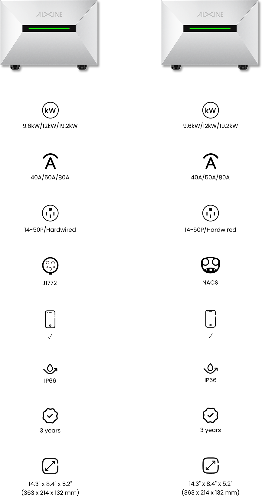 • Maximum 19.2kW (240 VAC @ 80 A model)